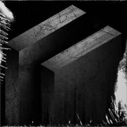 Black and white image of two minimalist wristwatches on a textured rock surface.